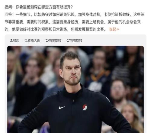 所以说白了,现在教练组还是认为杨瀚森并不具备打NBA的能力。现阶段可能还是需要去努力提升自己的能力,看看将来能不能够寻找到机会。主教练也认为属于杨瀚森的机会终究到来,也许到赛季中后期球队会出现伤病潮,杨瀚森会拥有更多的出场时间。现在他需要努力,将来机会到来之后杨瀚森才可以彻底把握得住。
